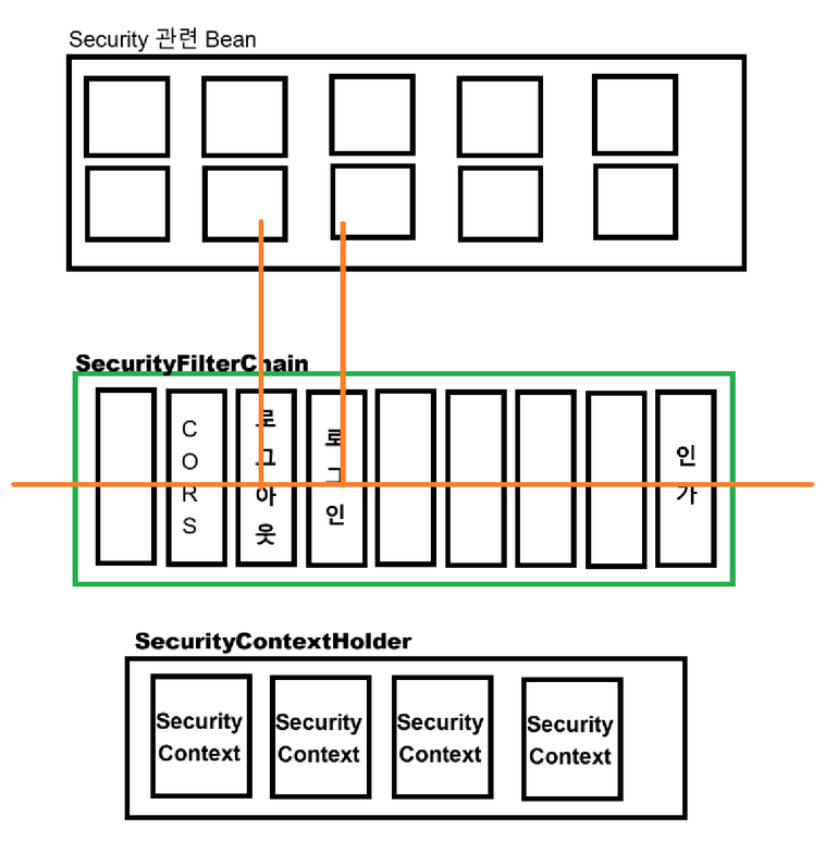 SecurityFilterChain 내부에 존재하는 각각의 필터가 시큐리티 관련 작업을 진행한다.