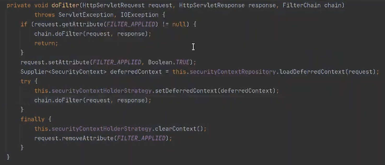 SecurityContextHolderFilterfinally { this.securityContextHolderStrategy.clearContext(); request.removeAttribute(FILTER_APPLIED); }