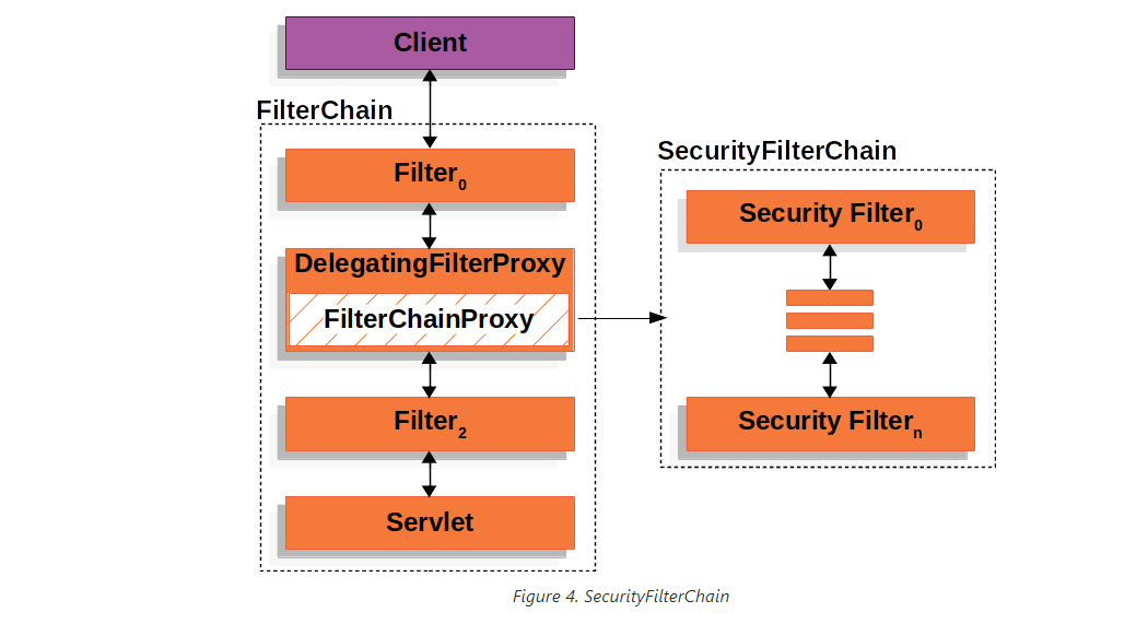 - DelegatingFilterProxy: 스프링 Bean을 찾아 요청을 넘겨주는 서블릿 필터