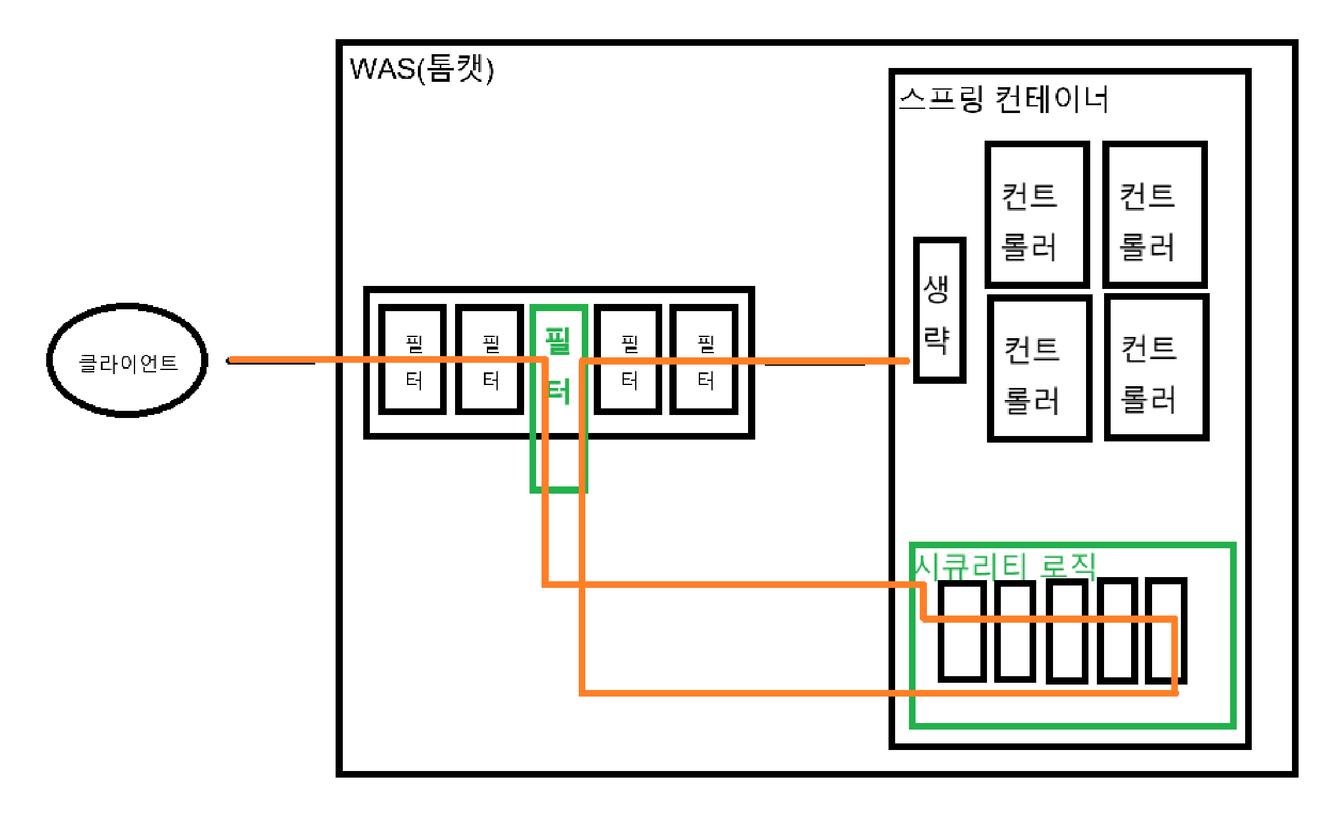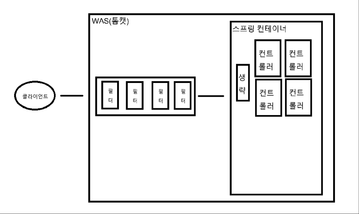 클라이언트의 요청은 서버의 WAS(톰캣)의 필터들을 통과한 뒤, 스프링 컨테이너의 컨트롤러에 도달한다. (컨트롤러 앞단의 과정은 생략)