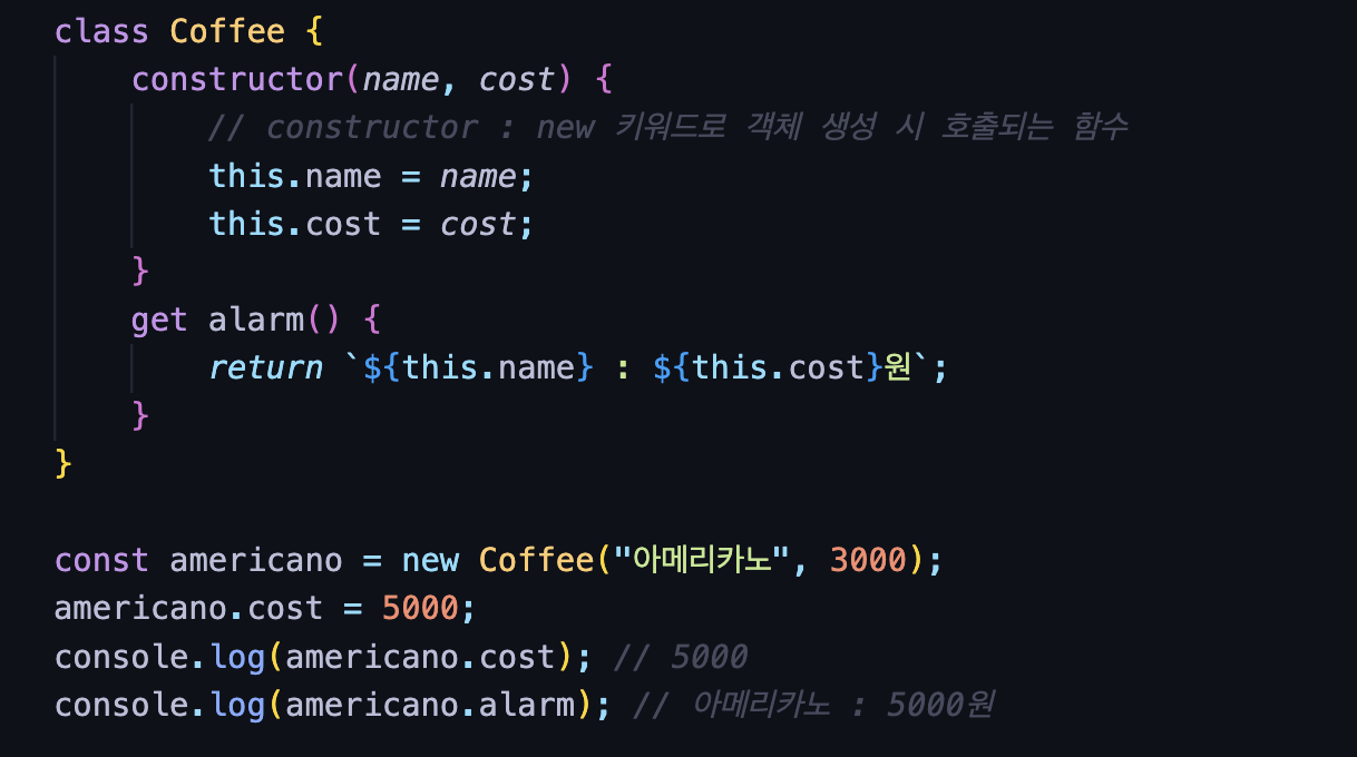 함수 앞에 get을 붙이면 함수를 호출하듯 ()괄호를 붙이지 않아도 값을 나타낼 수 있게 됨!