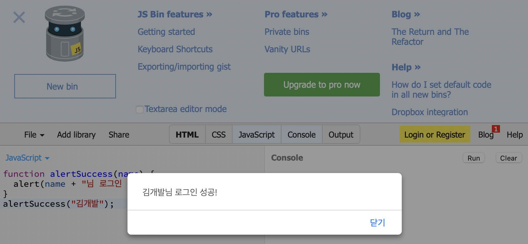 아래는 alertSuccess 이름을 가진 함수의 정의입니다. 로그인이 잘 됐으면, "로그인 성공!" 이라는 alert를 띄우는 함수입니다.