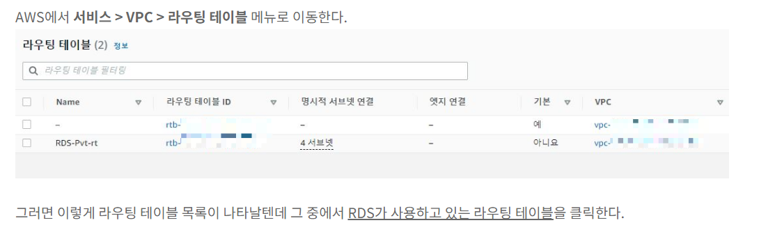 여기서 이런 오류가 발생하면 먼저 EC2에서 연결된 RDS인바운드 규칙을 수정하고 RDS에서 인바운드 규칙을 추가해준다.그리고 RDS의 퍼블릭 액세스 여부를 허용하고, 보안 그룹에서 3306 포트까지 열어줬지만 여전히 외부 연결이 안되는 사람들은 대부분 RDS가 사용하는 서브넷이 Public이 아닌 Private이라서 문제가 생기는 것이다. 그래서 서브넷을 Public으로 변경하는 방법에 대해 알려드리고자 한다.
