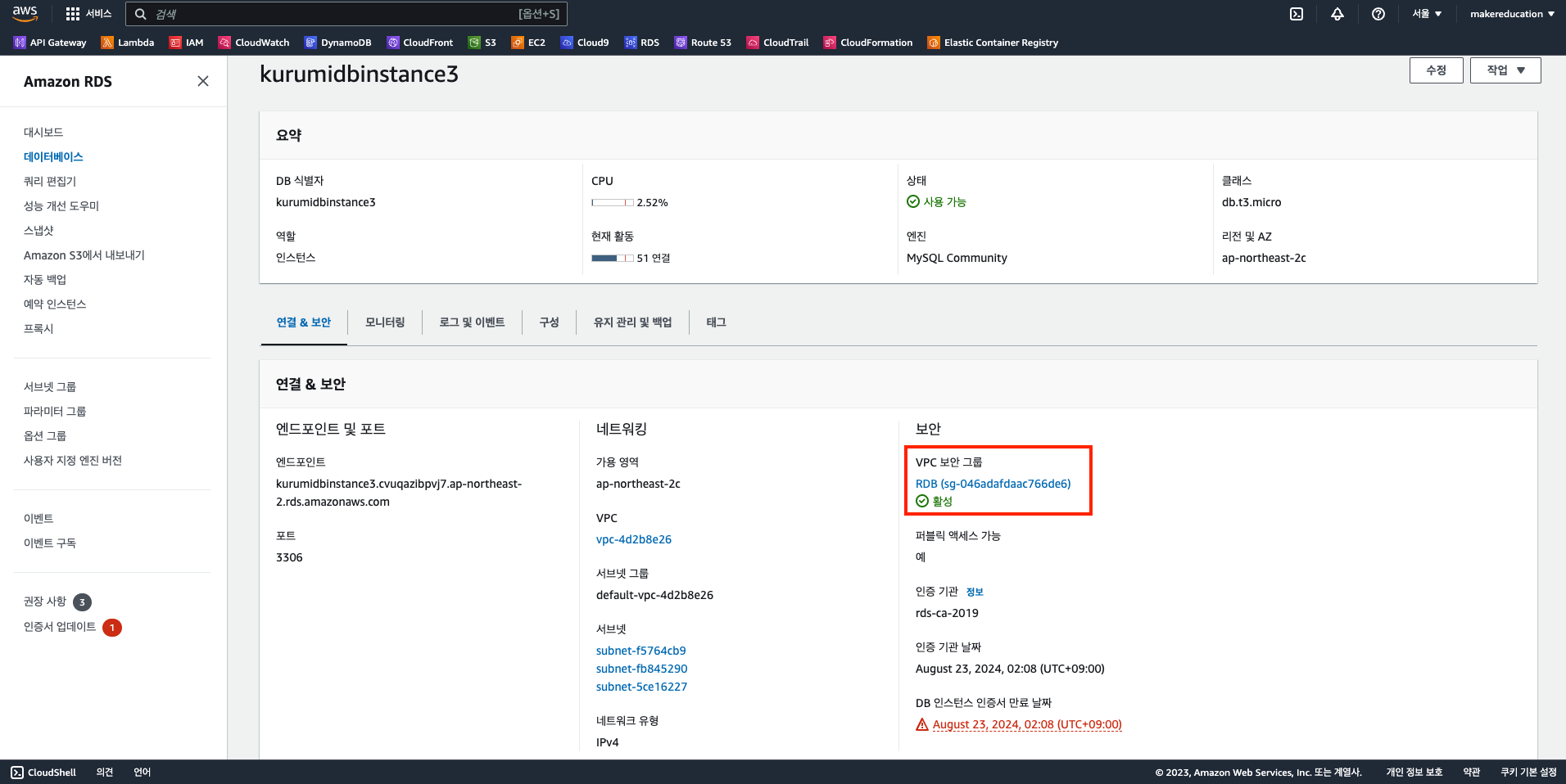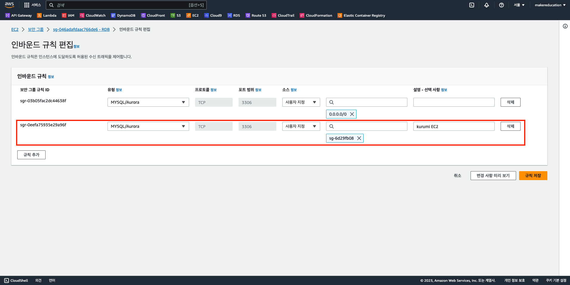 - 작업할 EC2 의 보안그룹을 RDS 의 보안그룹 인바운드 규칙에 추가합니다.