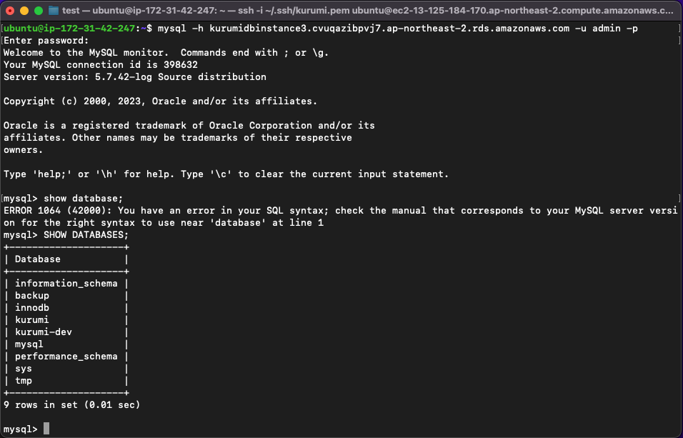 mysql -h kurumidbinstance3.cvuqazibpvj7.ap-northeast-2.rds.amazonaws.com -u admin -p