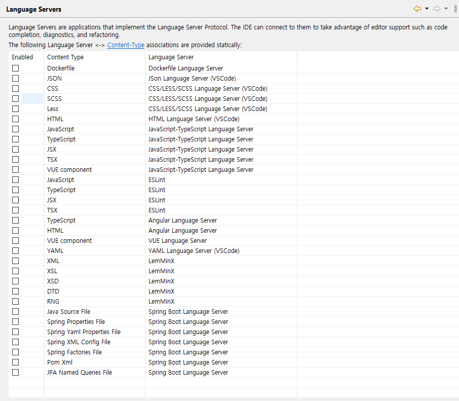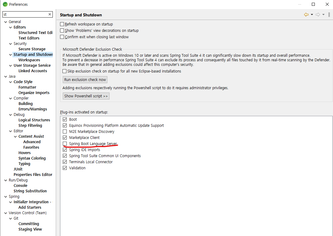 설정 => Startup and Shutdown => spring boot language server 비활성화