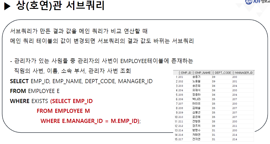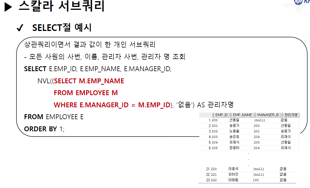 없으면 '없음'을 반환(메인으로 리턴) 이후 메인에서 SELECT 절을 수행하고 다시 2행인 송종기를 가지고 서브쿼리로 이동 -> 조건절을 수행(송종기의 MANAGER_ID와 같은 EMP_ID인 선동일 리턴)