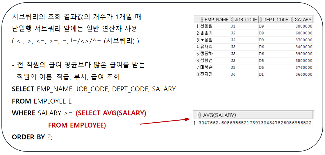 서브쿼리 안의 내용(전 직원의 평균급여를 계산)의 조회 결과가 하나이기 때문에 일반 연산자를 사용하여 EMPLOYEE 테이블에서 평균 급여보다 높은 급여인 직원의 정보 조회