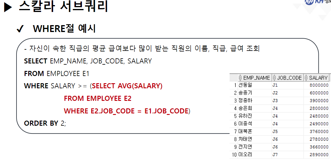 서브 쿼리: 메인쿼리의 JOB_CODE를 가지고 WHERE문 실행