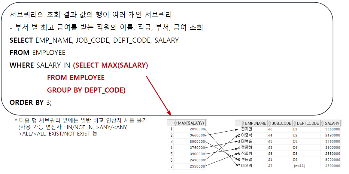 서브쿼리 안의 내용(부서별 최고 급여를 받는)의 결과가 그림처럼 다수의 행으로 표현됨