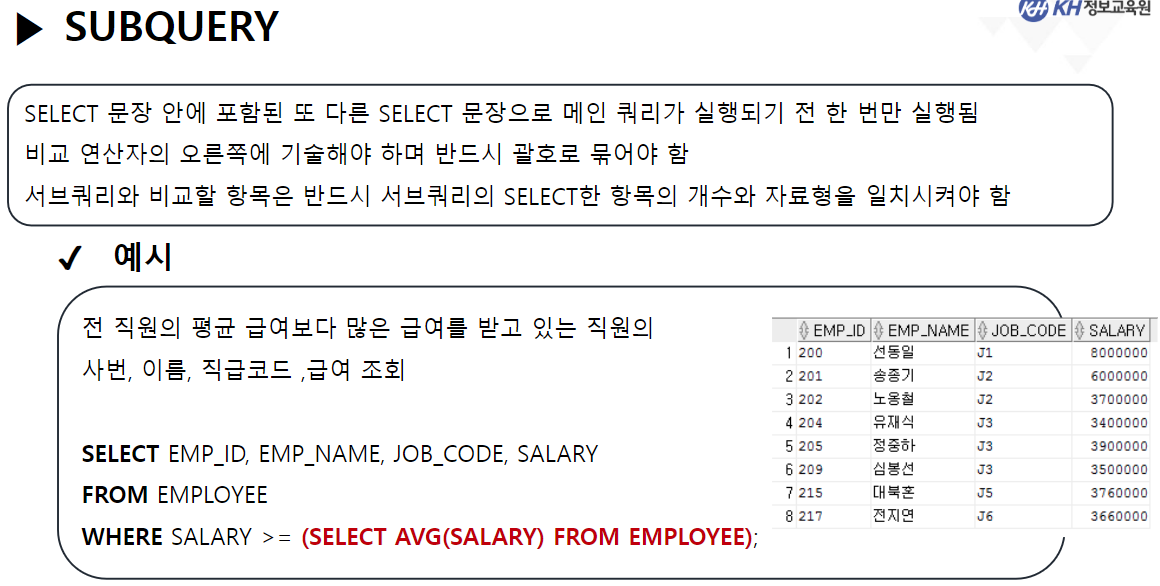 WHERE SALARY > (SELECT AVG(SALARY) -- SUB 쿼리
