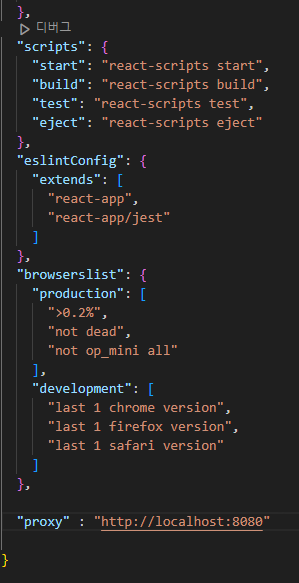 "proxy" : "http://localhost:8080" 을 통해 요청이 정상적으로 보내지게 설정