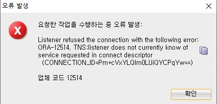 이런 에러가 나왔다. 리스너가 요청되는 서비스를 모른다는 내용 같아서 찾아보니 Oracle 데이터베이스의 리스너가 요청된 서비스 이름을 인식하지 못할 때 발생한다고 한다.