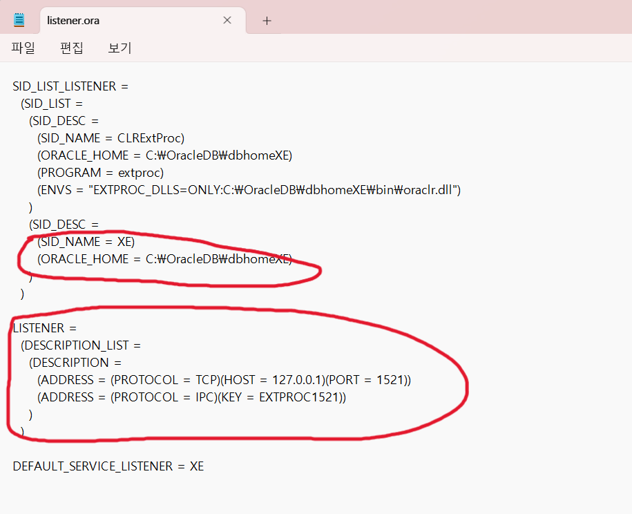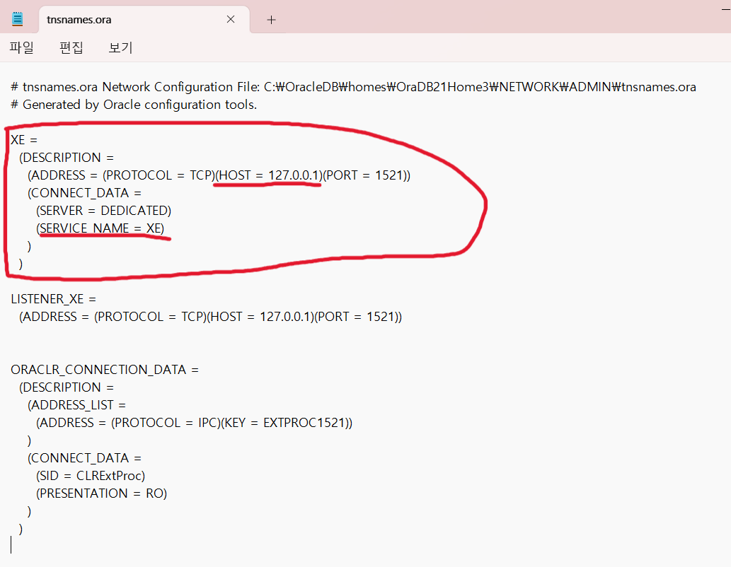 이런식으로 작성되어 있는데 tnsnames 의 Host와 SERVICE NAME 이 맞게 선언되어 있는지 확인하고 리스너 파일에서 동일한 값을 사용하는지 확인한다.