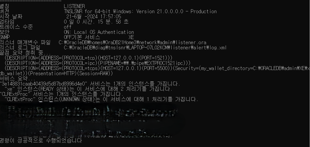 이러고 다시 cmd 창에서 리스너의 상태를 확인한다. 본인이 설정한 서비스 이름에 대한 처리기가 나오면 성공.