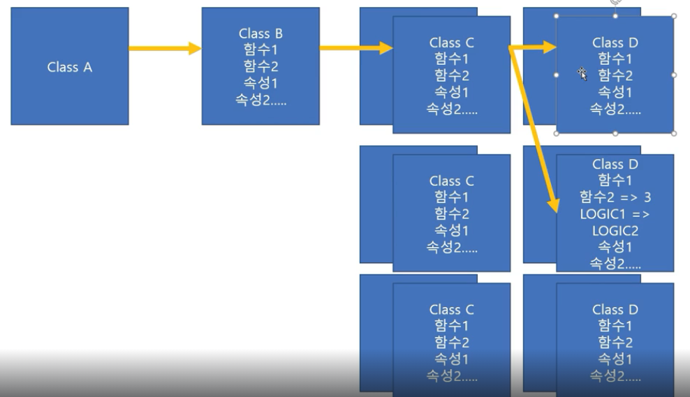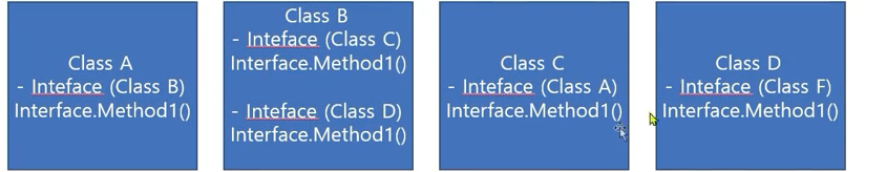 이처럼 여러 클래스 간에 유기적으로 연결되어 있는 경우 하나의 클래스를 변경하면 그 클래스에 의존하는 여러 클래스들이 영향을 받아서 유지보수가 매우 힘듬