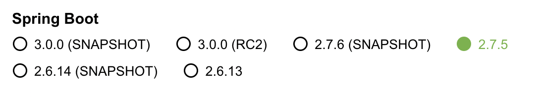Spring Initializr에서는 사용할 수 있는 스프링 버전 목록을 나열해 주는데 각 버전마다 다른 접미사를 가지고 있는 것을 볼 수 있다.