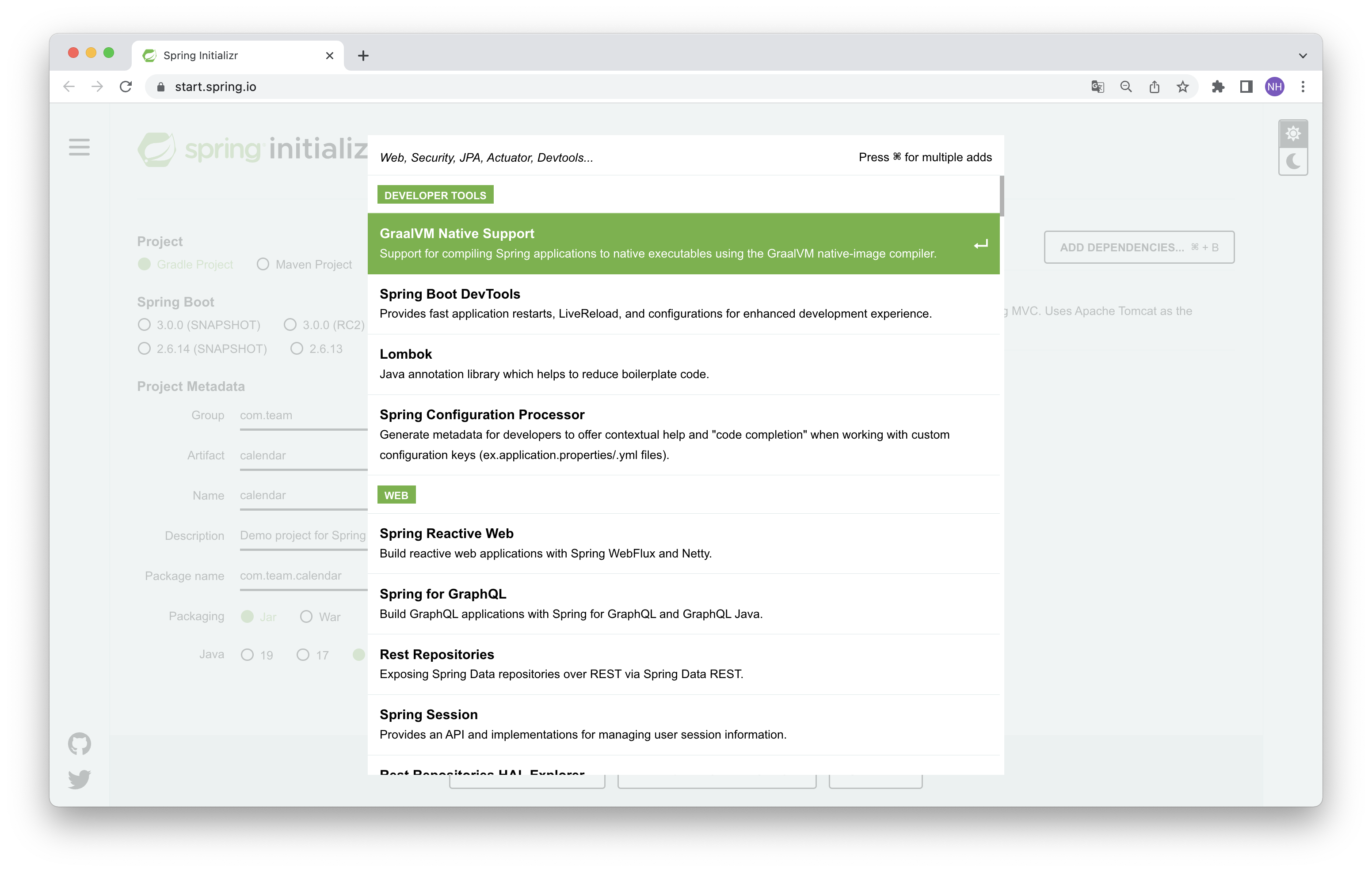 오른쪽의 ADD DEPENDENCIES 버튼으로 필요한 라이브러리를 추가해 프로젝트를 생성할 수도 있다. (라이브러리에 대한 자세한 내용은 여기 를 참조하기)
