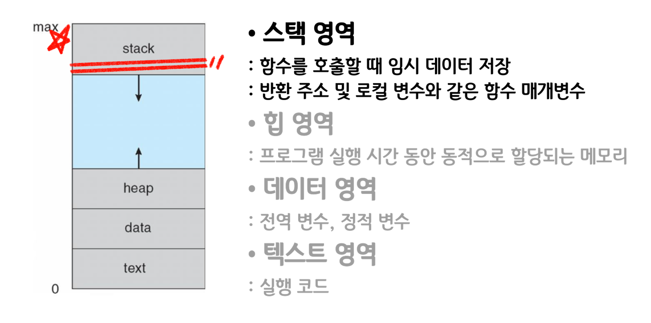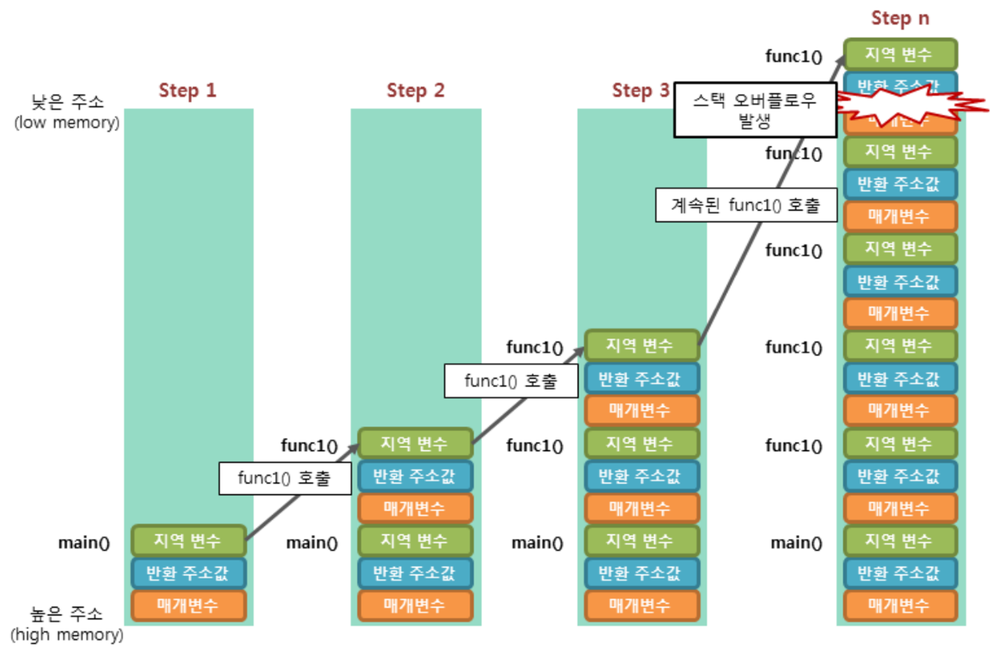 만약 재귀 호출이 무한히 반복되면, 그림처럼 재귀 호출에 의한 스택 프레임이 계속해서 쌓여만 갈 것이다. 이렇게 스택의 모든 공간을 다 차지하고 난 후에 또 다시 스택 프레임을 저장하게 되면, 해당 데이터는 스택 영역을 넘어가서 저장되게 된다. 만약에 스택 영역을 넘어가지 못하고 프로그램이 이 오류로 인해 종료되는 것이 아니라 스택 영역을 넘어가도 데이터가 저장될 수 있으면, 개발자가 알 수 없는 오동작을 하게 되거나 보안상의 크나큰 취약점을 가지게 된다.