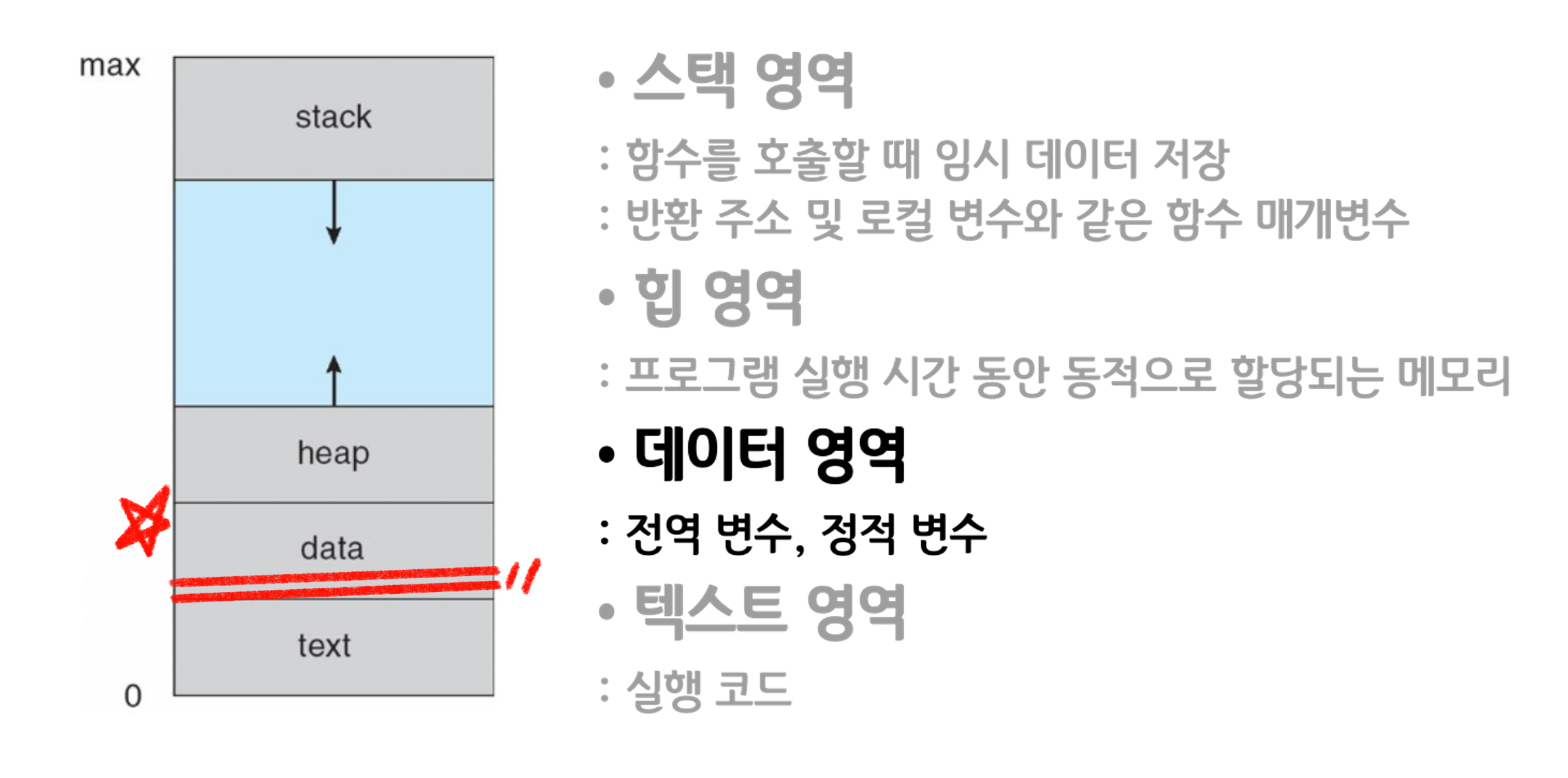 전역 변수와 정적 변수가 저장되는 영역이다. 보통 프로그램의 실행부터 종료 때까지 데이터가 존재한다.