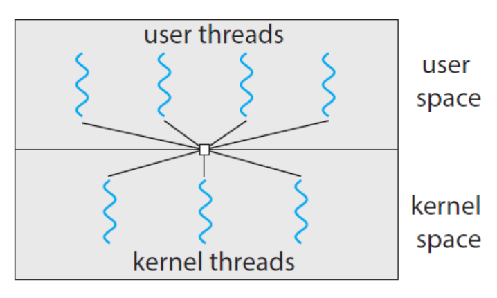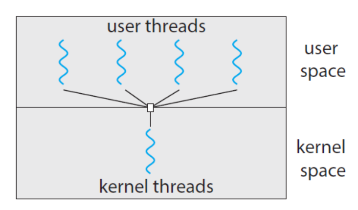 다대일 모델에서는 여러 개의 사용자 수준 스레드가 하나의 커널 스레드에 매핑된다. 이 모델은 스레드 관리가 사용자 공간의 스레드 라이브러리에 의해 이루어지기 때문에 효율적이라는 장점이 있다. 하지만 하나의 사용자 스레드가 블로킹 시스템 콜을 호출하면 전체 프로세스가 블록될 수 있다는 심각한 단점이 있다. 또한, 한 번에 하나의 스레드만이 커널에 접근할 수 있어 다중 스레드가 다중 코어 시스템에서 병렬로 실행될 수 없다.