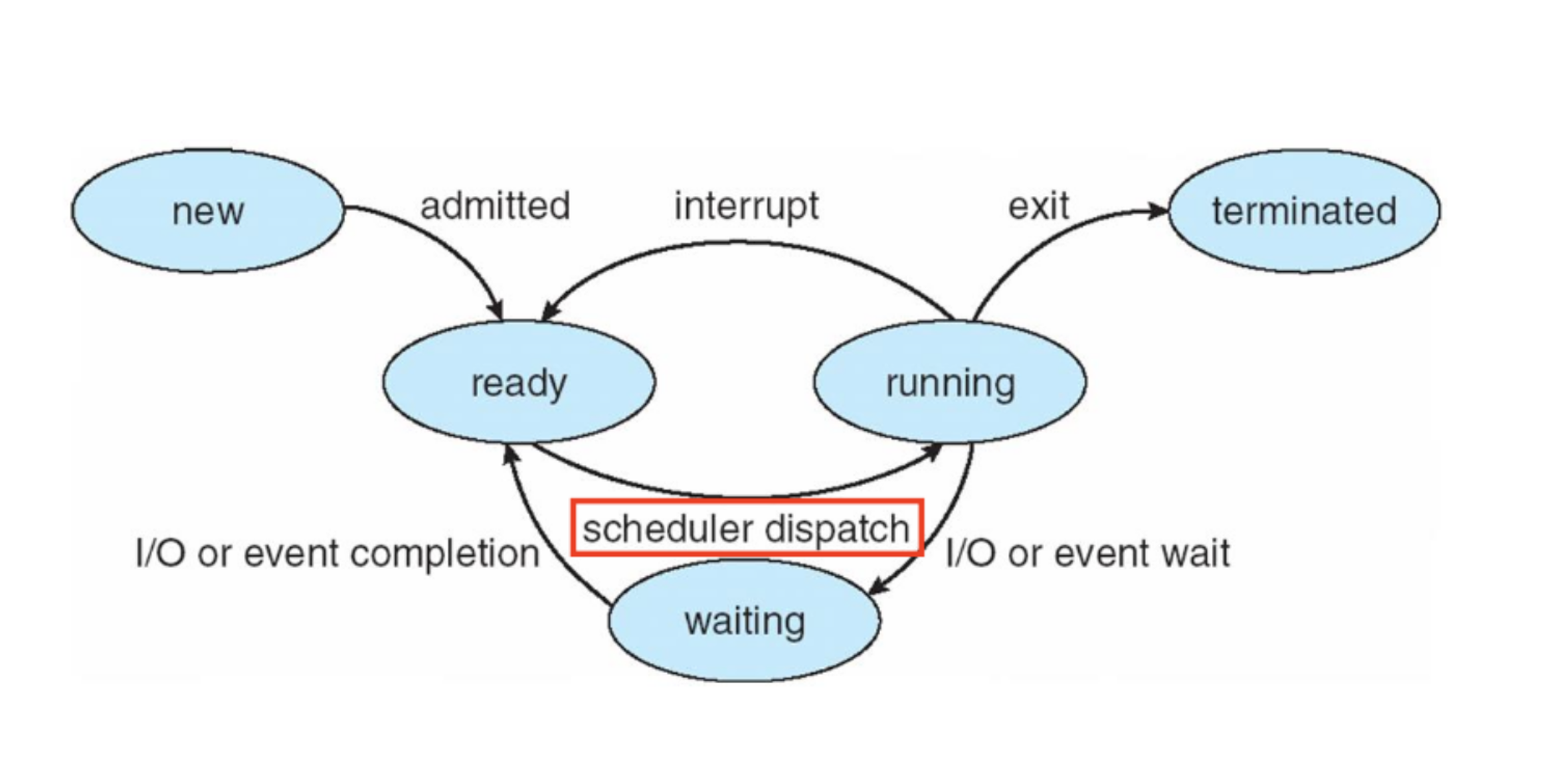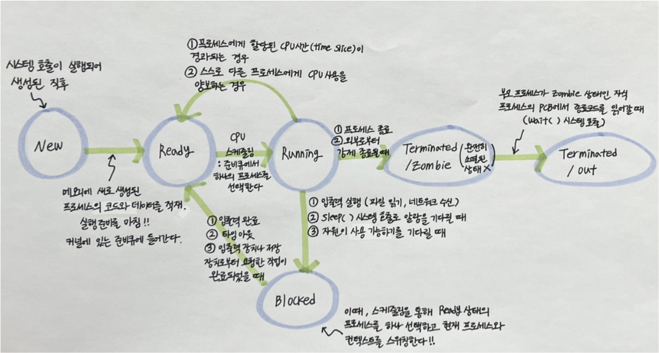 ready 상태에서 dispatch(스케줄 이라고도 한다)가 되어 CPU를 할당받아 실제 수행되고 있는 상태를 말한다. 그런데 프로세스 하나가 CPU를 독점하는 것을 방지하기 위해, timeout을 시켜 강제로 다시 ready 상태로 돌아가게 할 수도 있다. 이를 선점(preemptive) 한다라고도 한다.ready상태로 돌아간다.running 상태인 프로그램이 종료되면 terminated 상태가 된다.+) 아래와 같이 각 상태로 변경되는 경우를 작성해보았다.