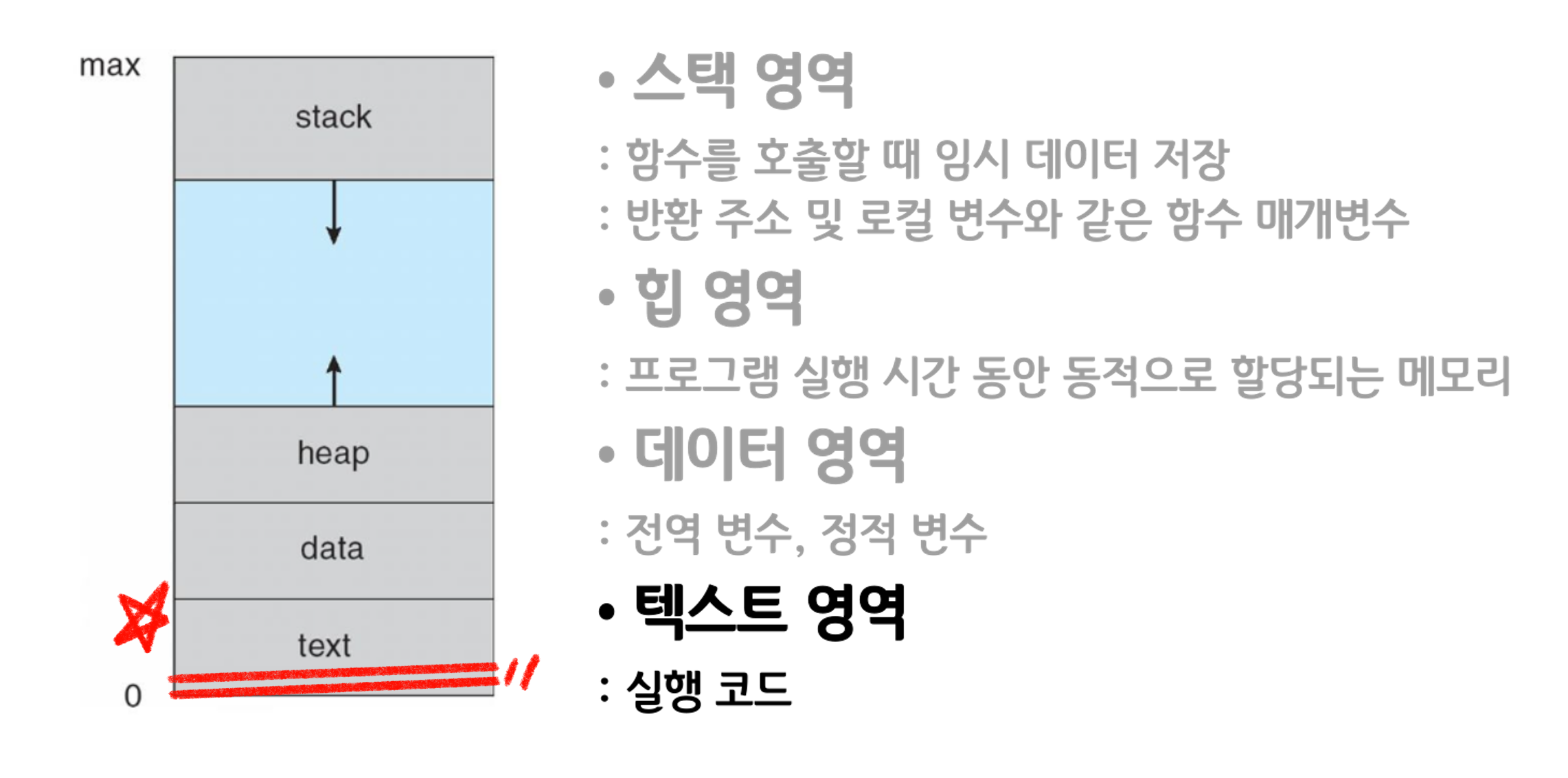 함수나 메서드의 명령어 같이 프로그램의 실행 코드가 저장되는 영역이다. 주로 읽기 전용(Read-Only)으로 설정되어 있어 코드가 변경되지 않도록 보호된다.