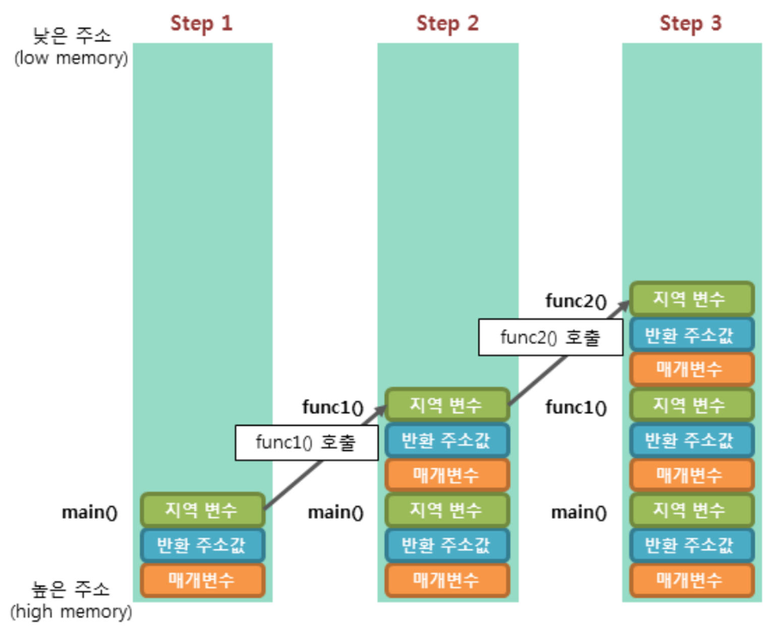2) func1() 함수를 호출하면 해당 함수의 매개변수, 반환 주소값, 지역 변수 등의 스택 프레임이 스택에 저장된다.