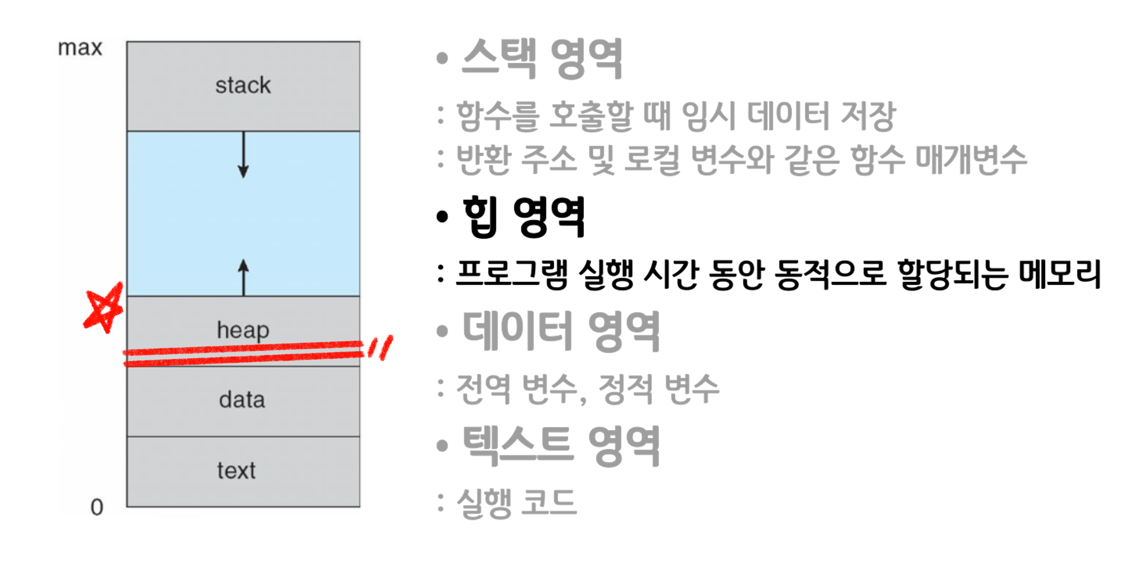 프로세스의 주소 공간은 물리 공간이 아니라 가상공간이다. 바로 이 가상주소 공간의 사용자 공간에 프로세스가 실행 중에 동적할당 받는 힙 영역이 있다.