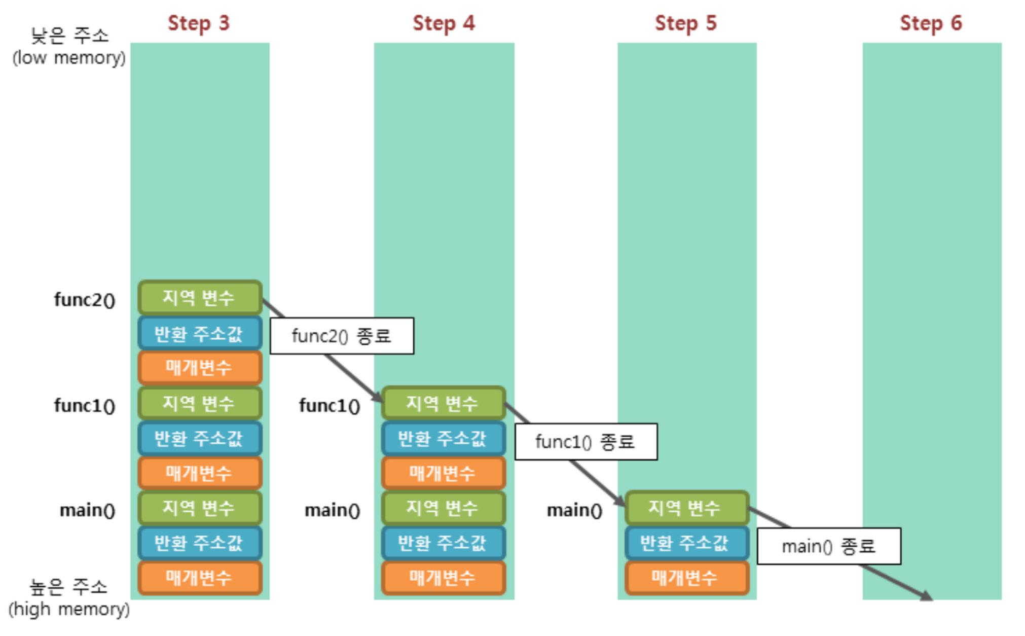 이렇게 스택 영역에 차례대로 저장되는 함수의 호출 정보를 스택 프레임(stack frame)이라고 하는데, 스택 프레임은 함수 호출 시 생성되고, 반환 시 제거된다. 이러한 스택 프레임 덕분에 함수의 호출이 모두 끝난 뒤에, 해당 함수가 호출되기 이전 상태로 되돌아갈 수 있다.