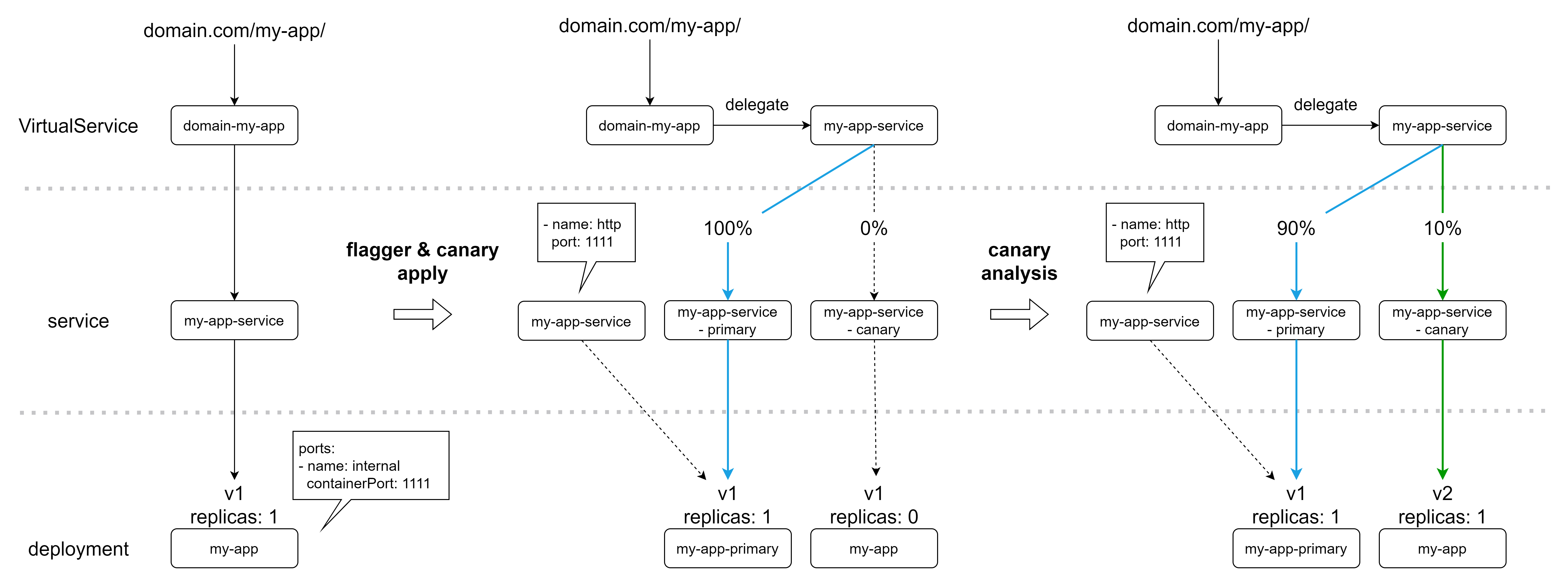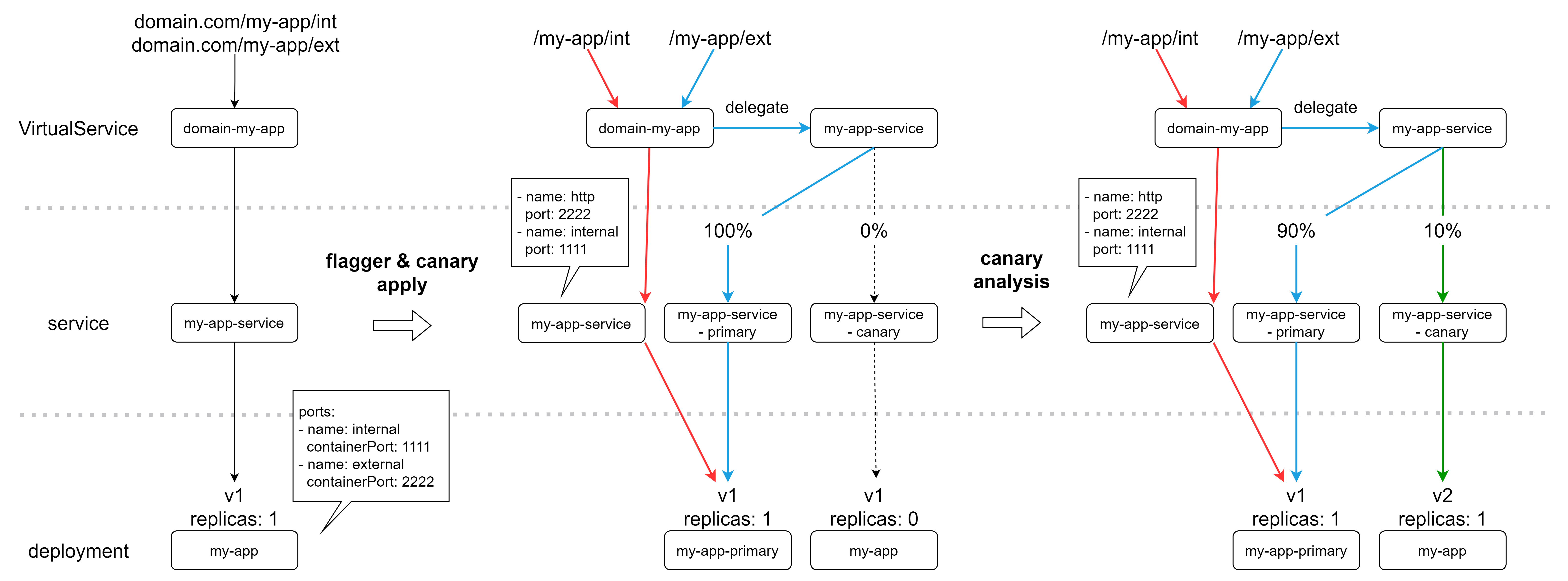 canary manifest에서 설정만 바꾸면 blue/green 형식으로 사용 가능.