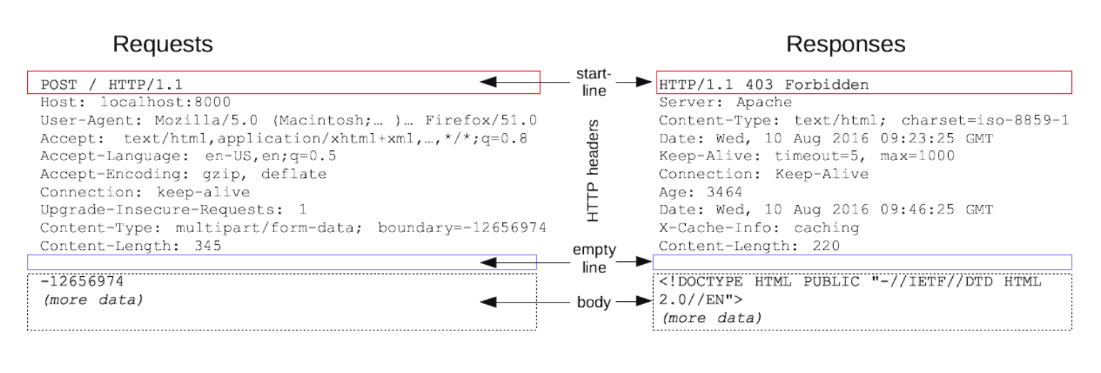 요청(Requests)과 응답(Responses)은 다음과 같은 유사한 구조를 가진다.