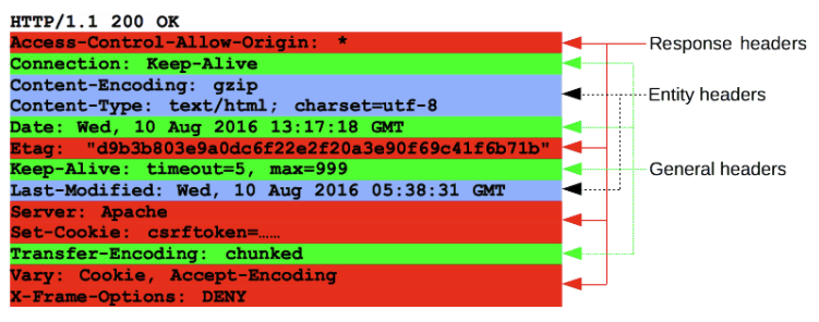 응답에 들어가는 HTTP headers는 요청 헤더와 동일한 구조를 가지고 있다. 대소문자 구분 없는 문자열과 콜론(:), 값을 입력한다. 값은 헤더에 따라 다르다.