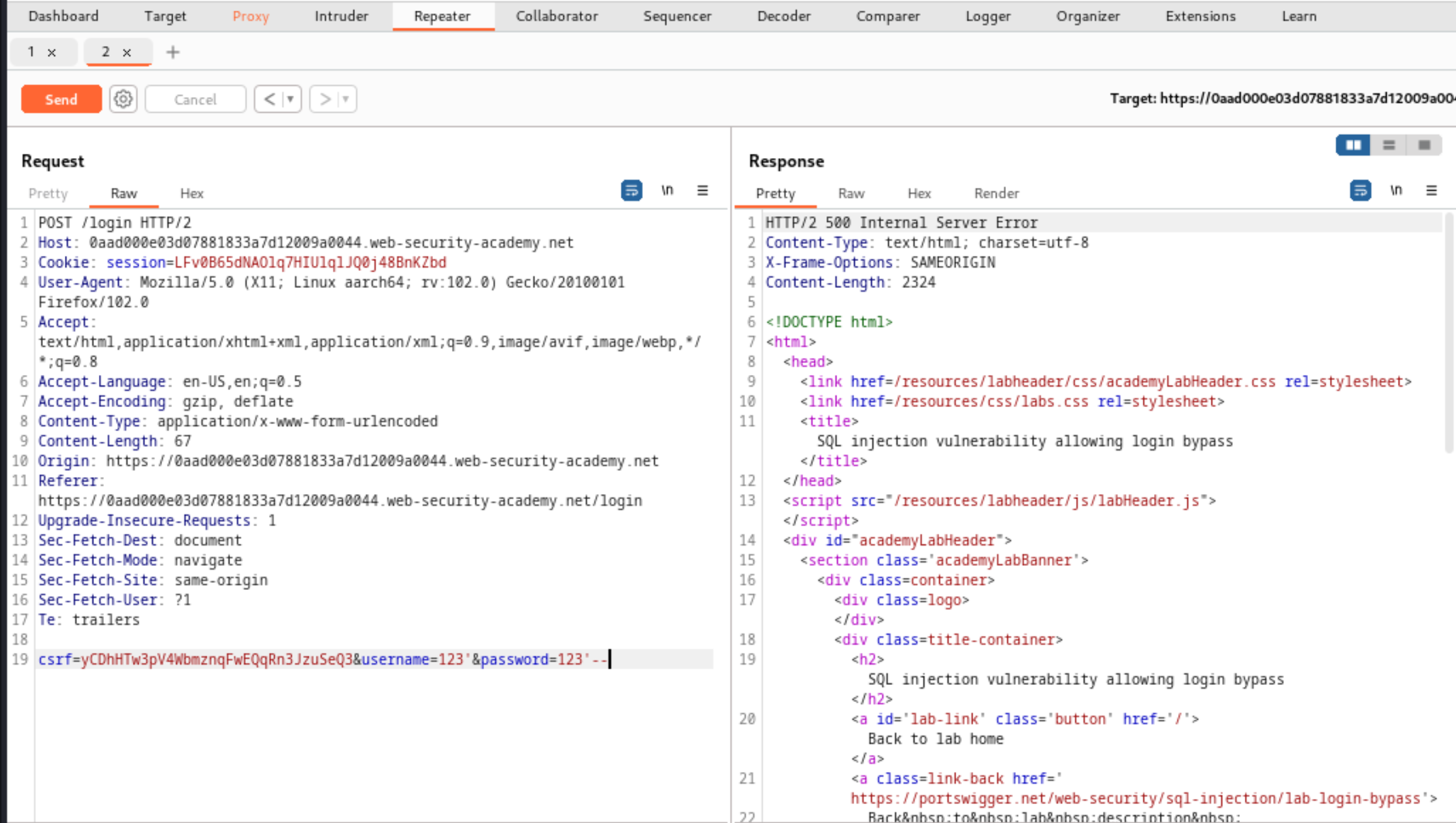 일단 로그인 부분에 취약점이 있으니까 사이트 상에서my account를 간 준 뒤에 Username, Password를 아무 값을 넣은 뒤, burpsuite repeater에서 Username 값 뒤에 '를 넣어서 확인해 본다.
