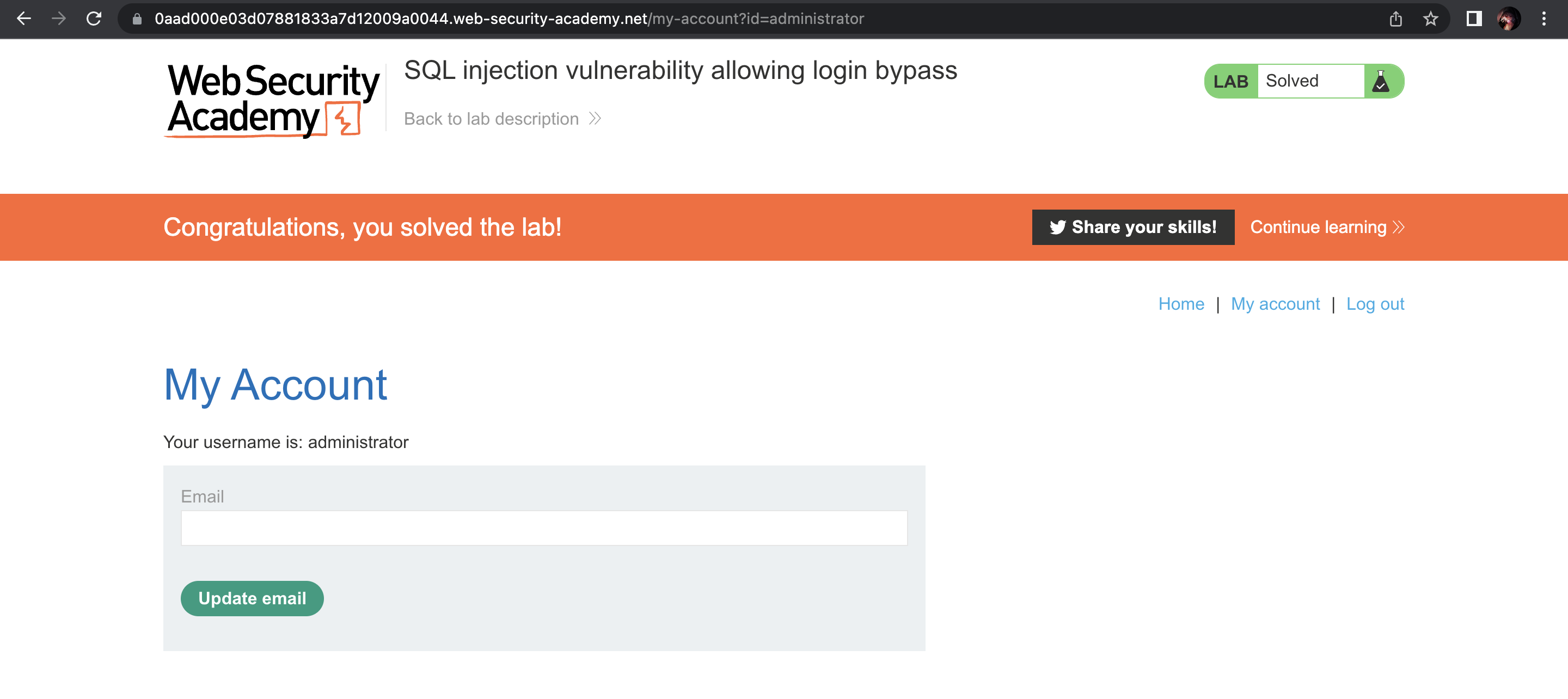 where절이 어떻게 되어 있는지 알았으니, 사이트 My account에서 Username 값에 administrator'--를 넣고, Password값에 아무 값이나 넣는다. 그러면 문제가 풀린다.