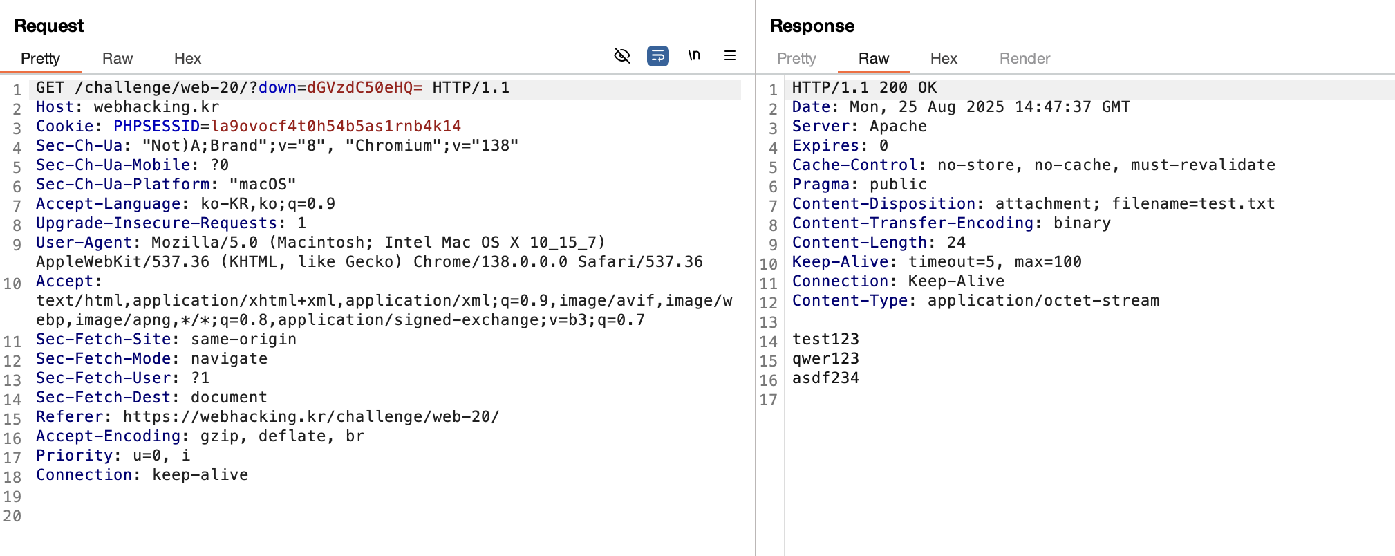 test.txt가 다운로드될 때 패킷을 확인해보면 요청값이 down=dGVzdC50eHQ= 이렇게 되어 있다.