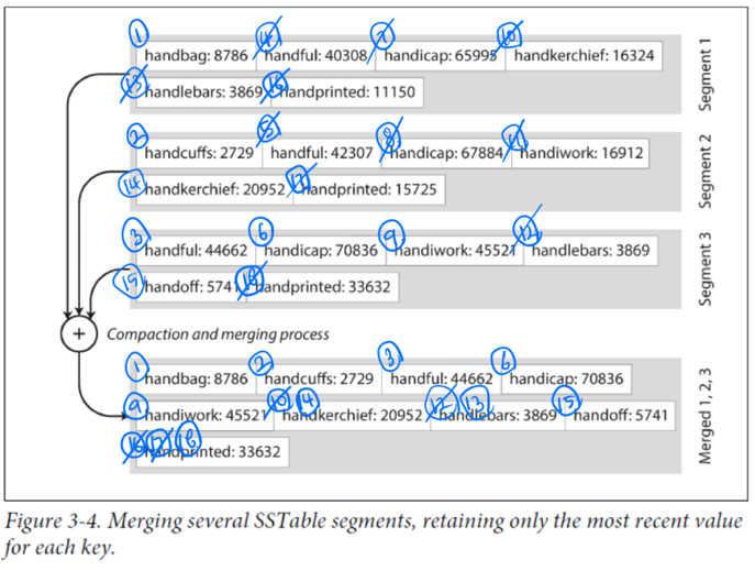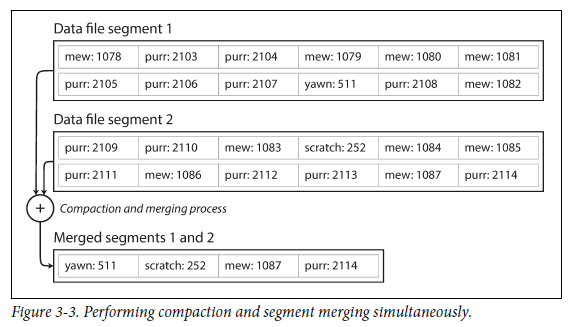 압축을 수행하면서 동시에 여러 segment를 병합할 수도 있다. 병합된 segment는 새 파일에 작성된다. 고정된 segment의 병합 및 압축은 background thread에서 실행될 수 있기 때문에 수행 도중 read/write 요청이 들어오더라도 이전 segment를 사용하여 정상적으로 처리가능하다. 수행이 완료되면 새로 병합된 segment를 사용하고, 이전 segment는 삭제한다.
