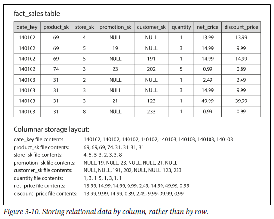 아래 사진은 그림3-9의 예제를 column-oriented storage로 구성한 것이다. 각 column file에 포함된 row가 모두 같은 순서로 배치되어 있다.