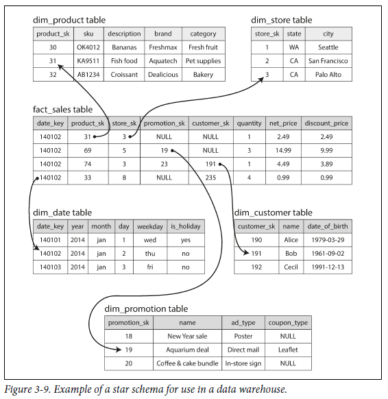 star schema라는 이름은 dimension table을 사용해 표현한다. (dimension table을 사용해서 분석이 가능함 ex. 휴일과 평일의 판매 차이)