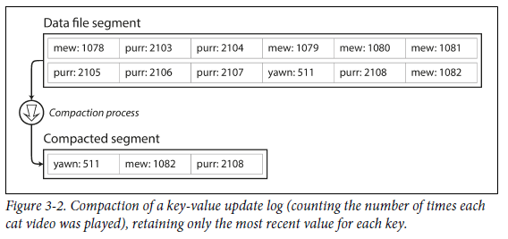 특정 크기에 도달하면 segment를 닫고 새 sement file에 subsequent write를 수행한다. 그 후, segment를 압축하는데, 여기서 압축이란 아래 그림처럼 log에서 중복된 key를 버리고 각 키에 대한 최신 update만 유지하는 것이다.