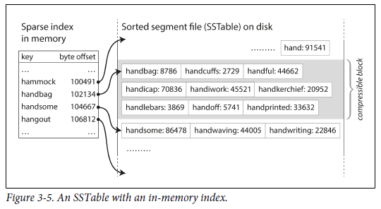 file에서 특정 key를 찾기 위해 메모리에 모든 key의 index를 저장하고 있을 필요가 없다. (key를 기준으로 정렬되어 있으므로, 해당 메모리에 저장되어 있지 않은 key를 찾으려면 그 key보다 사전순으로 앞에 있는 key의 offset으로 이동해서 찾으면 된다.) 하지만 일부 key는 저장 할 필요가 있다.