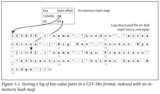 log를 사용한다. index라고 하는 data structure가 필요하다.Hash map은 key-value data를 구현할 때 사용된다. inmemory data structure에서 쓰이는 hash map을 disk에 있는 data의 index로 쓰는 방법은 다음과 같다.