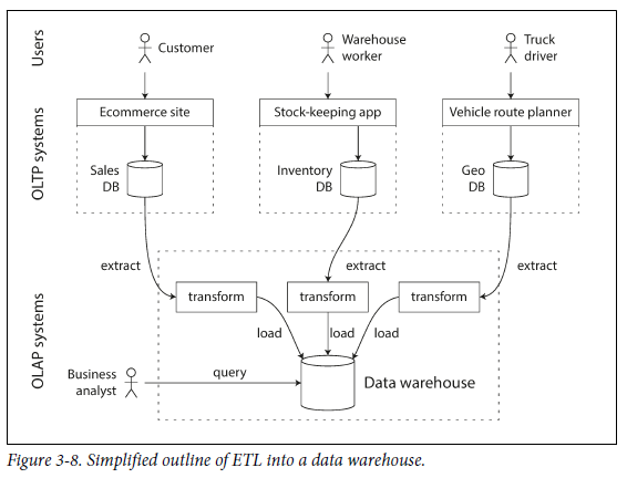 데이터는 아래 그림처럼 OLTP 데이터베이스에서 추출되고, 분석 친화적인 schema로 변환된 뒤, 깨끗하게 정리되어 data warehouse에 load된다.