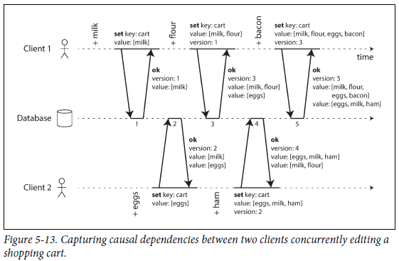 - 만약 2개의 write가 concurrent하게 발생하면, 어떤 순서로 발생했는지 모르기 때문에 두 write를 concurrent하게 merge하면 된다. (timestamp로 winner를 결정하면 clock skew 때문에 손실이 발생할 수 있다.)