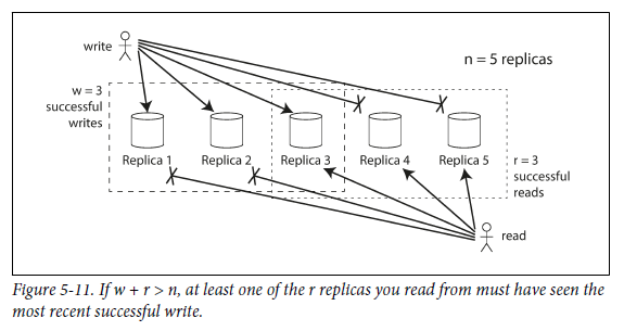 - sloppy quorum (뒤에 나옴)을 사용하면, w개의 write는 r개의 read와 다른 노드에서 수행될 수 있다.