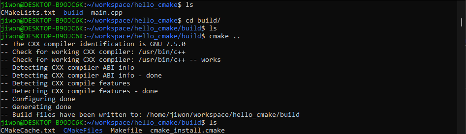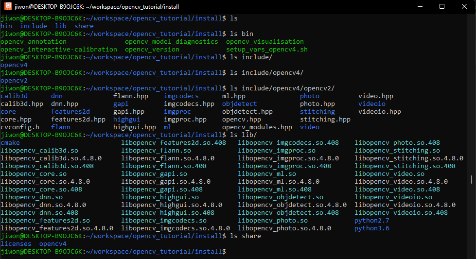 -DCMAKE_BUILD_TYPE: debug와 release 옵션 설정-GNinja: build system(=generator) 설정-DCMAKE_INSTALL_PREFIX: 로컬 파일 설치를 위한 경로 지정(install 저장 위치 설정)../opencv/: 최상위 CMakeLists.txt가 위치한 디렉토리build 폴더에 파일들이 생성됐다.