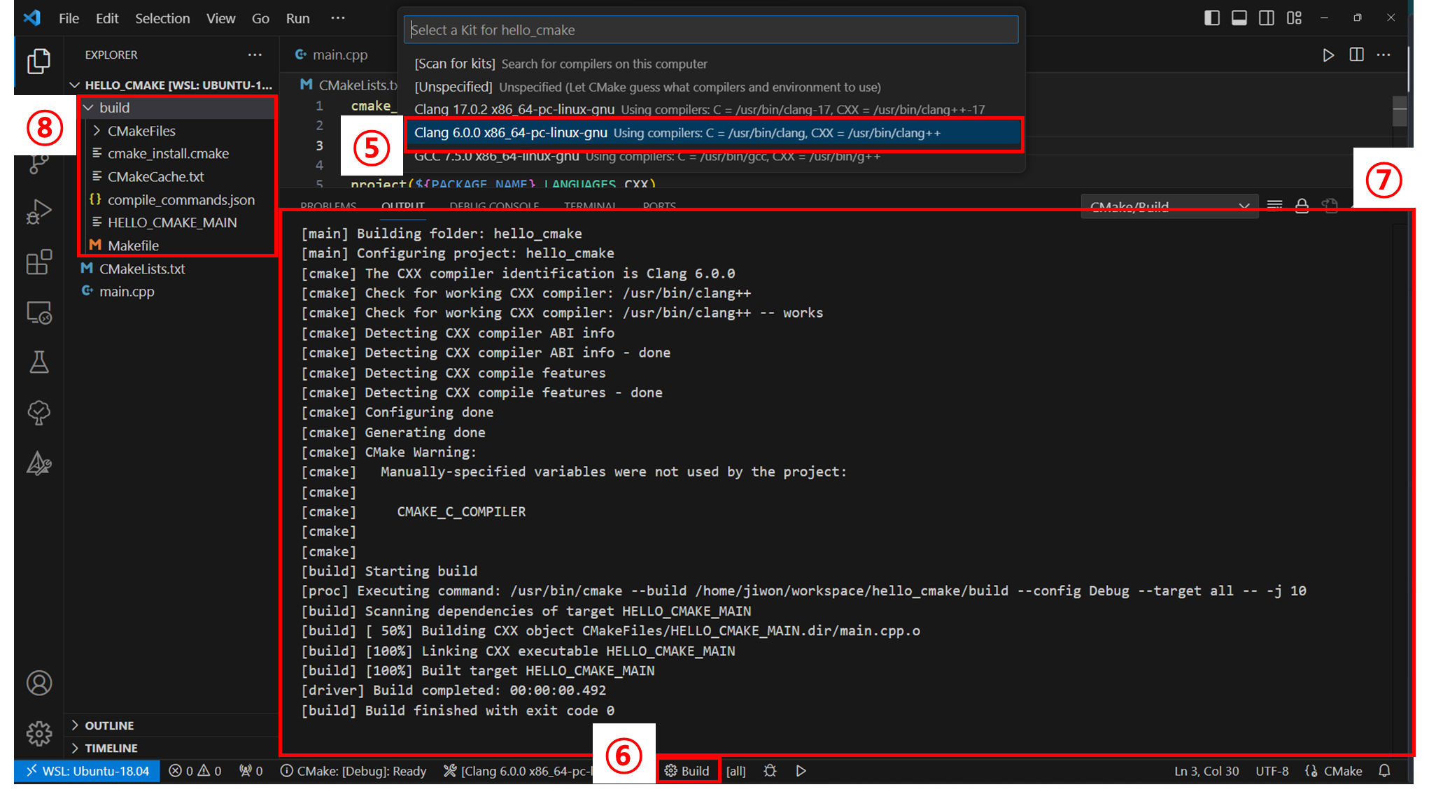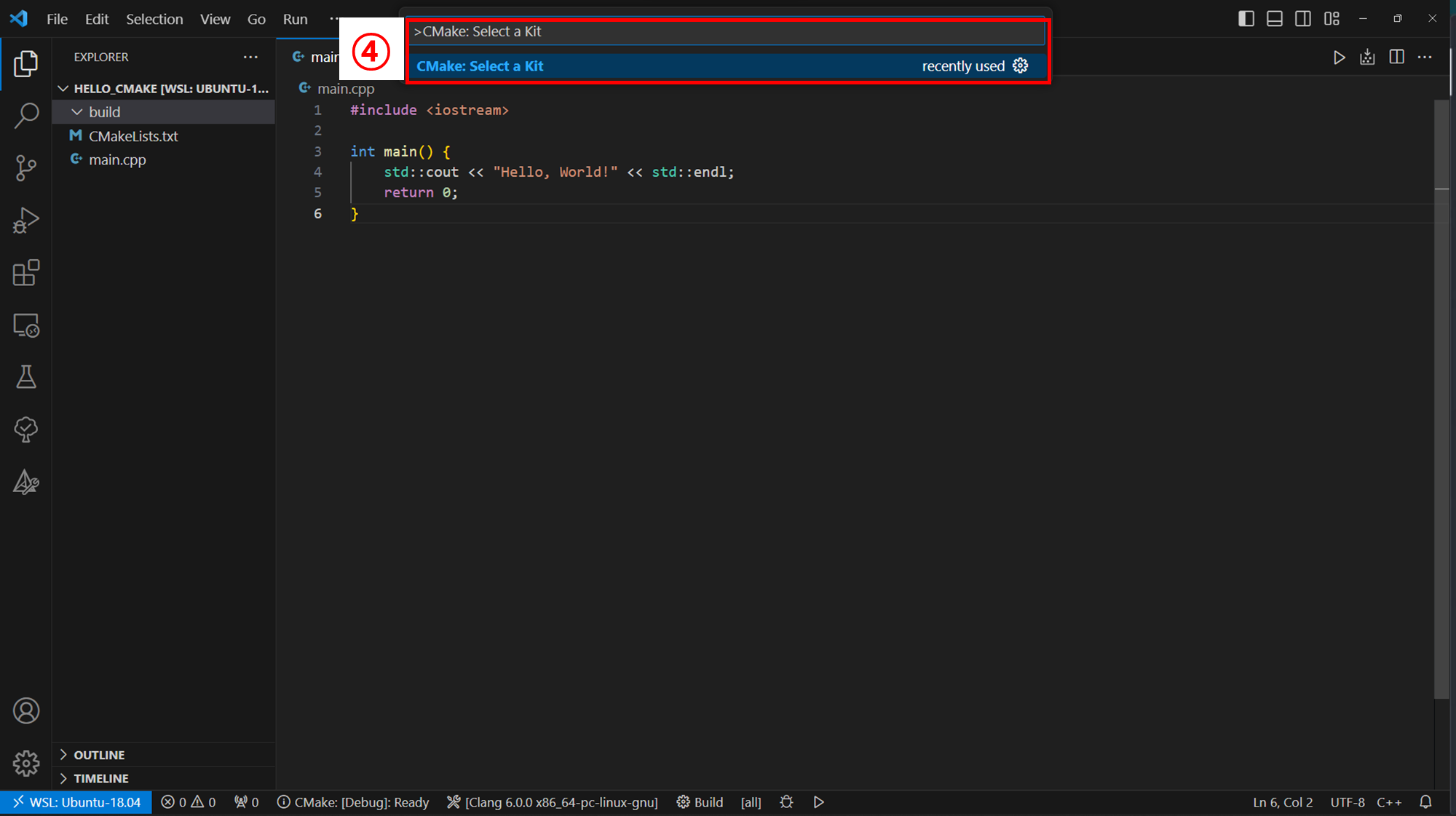 <CTRL+SHIFT+P> 키보드 입력 후 'CMake: Select a Kit'을 입력한다.