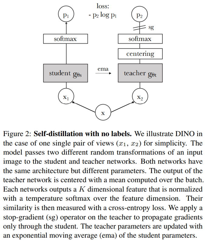 student network는 augmentation, local view를 input으로 받음. student의 softmax 출력을 teacher의 softmax 출력과 cross-entropy로 비교하여 parameter를 update함. (초기에는 teacher의 softmax가 의미 없긴 하지만...)
