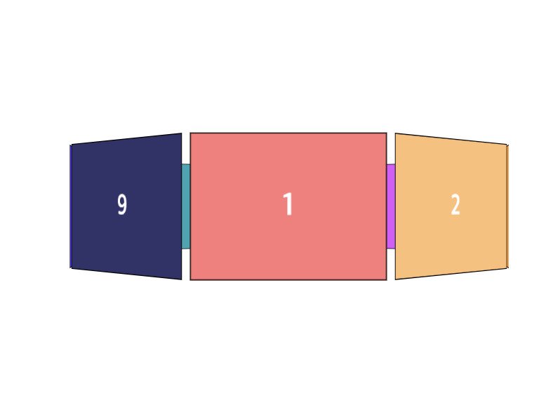 x축으로 회전해서 본 모형을 보면 가운데 꼭짓점을 중심으로 다음 위와 같은 사진과 같이 붙어있는 형태가 되어 있는 것을 알 수 있다. 따라서 원근법을 이용해서 파란색 선분이 있는 위치를 노란색 화살표 길이만큼 이동하여 정구각형 모서리를 210px만큼 만들어줘야한다. 노란색 선분 길이는 삼각함수를 사용하여 간단하게 구할 수 있다