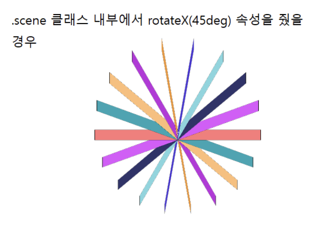 이제 현재 공간을 2D에서 3D로 변환시켜보자. 이를 위해 화면에는 원근감을 줘야한다. 원근감을 주기 위해 item 요소의 부모인 scene 태그에 perspective 속성을 줘야한다